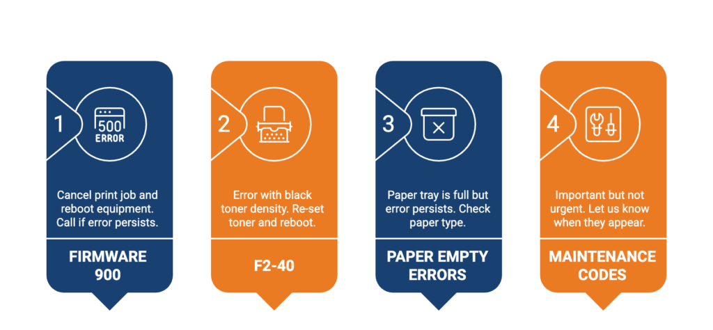 It is a general rule that you should call us when there are error codes, even for the simple things. It allows us to monitor your equipment so that we can maintain the integrity of the machine, often creating a better functioning office equipment and extending the life of it. We do our best to keep your machine at a 95% uptime during the duration of your work with us, and we provide service to stay true to it.